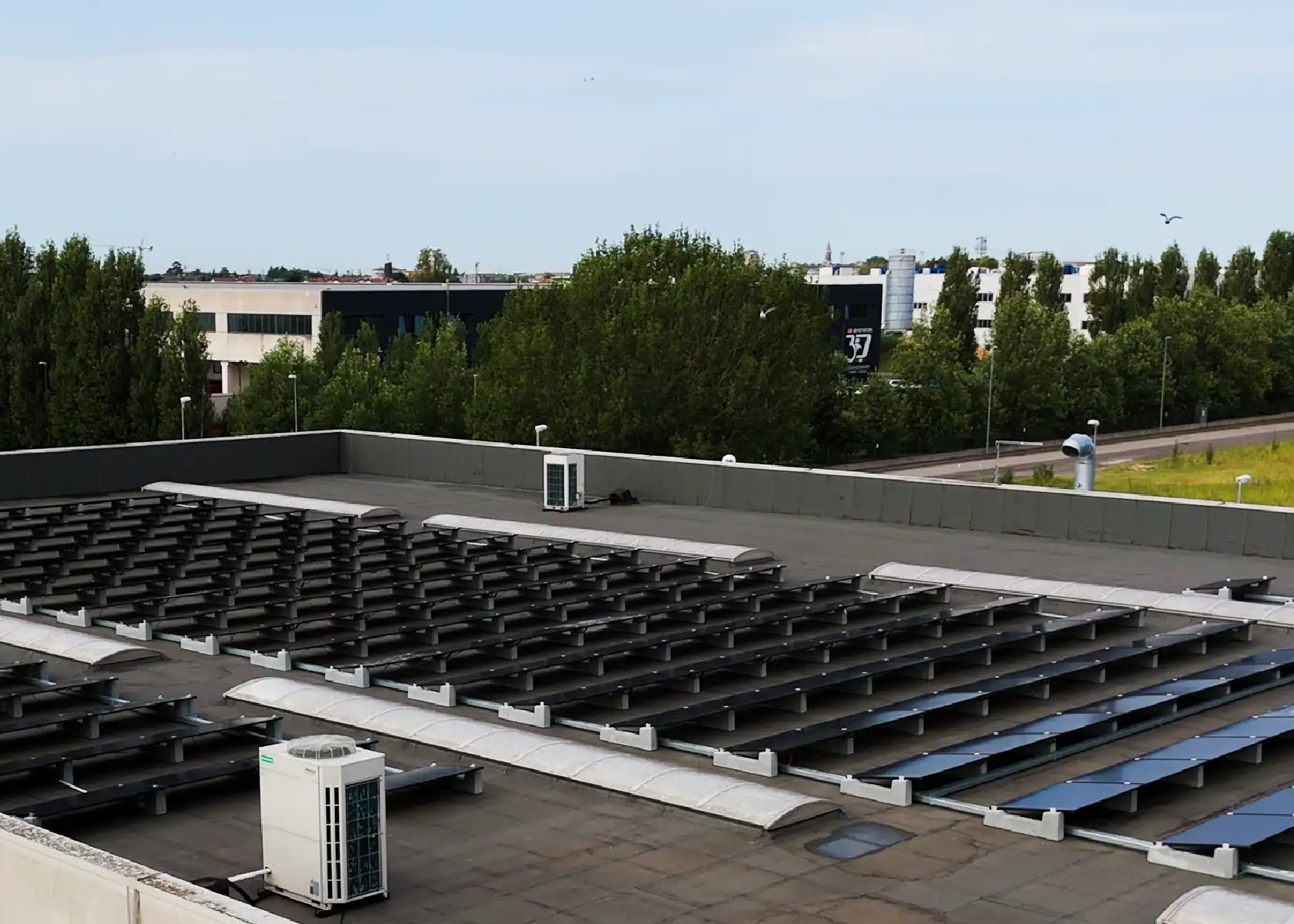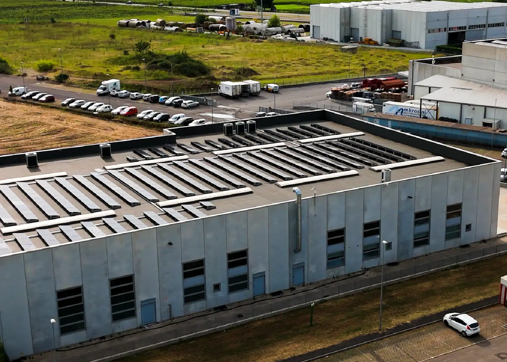 L’impianto è stato progettato per massimizzare la resa energetica e la sicurezza: i moduli sono fissati su strutture zavorrate in cemento, ottimizzate per ridurre gli ombreggiamenti e incrementare l’irraggiamento solare. Tutte le apparecchiature del fotovoltaico – inverter, quadri elettrici e batterie – sono state collocate in un nuovo locale tecnico esterno, così da mantenere la corrente continua al di fuori del capannone e garantire la piena conformità alle normative di prevenzione incendi.