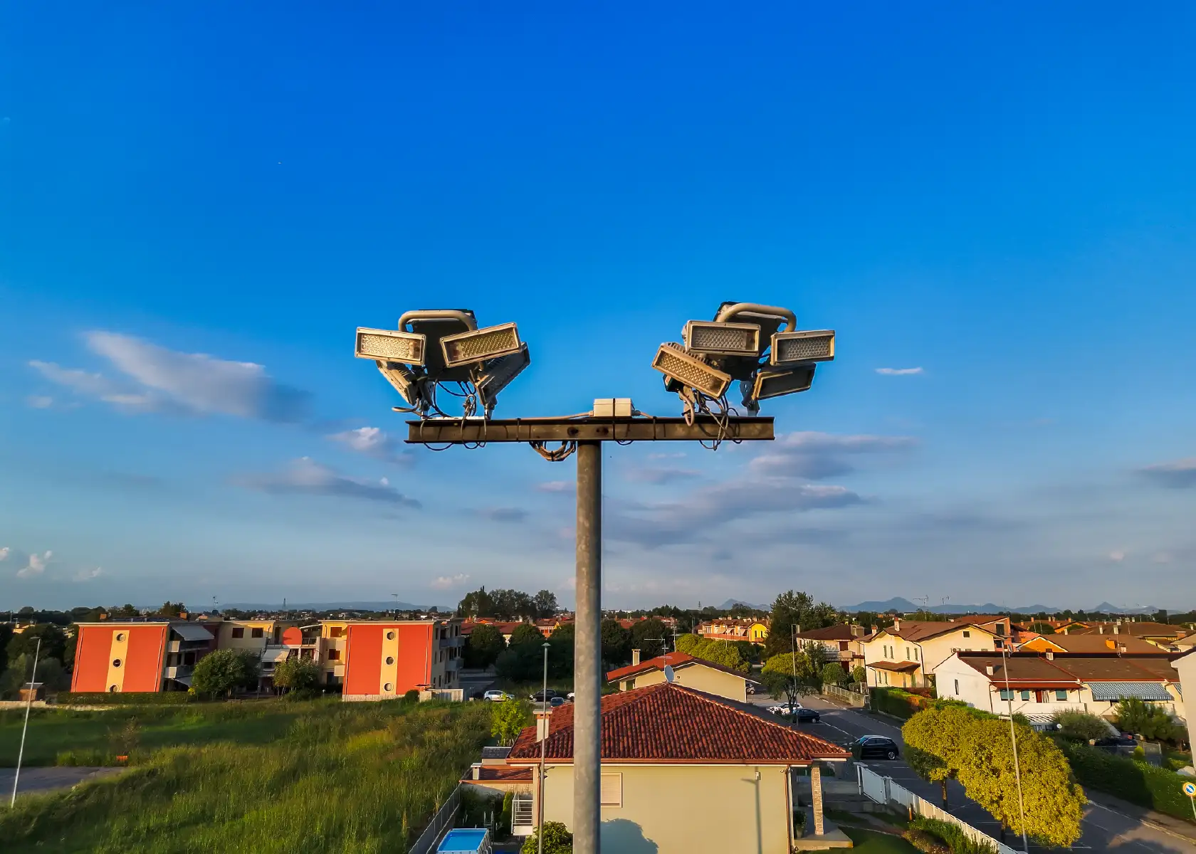 Sul campo principale è stato installato un nuovo impianto elettrico dedicato all’alimentazione dei proiettori a LED di ultima generazione. L’intervento ha previsto la posa di 6 nuovi pali da 16 metri fuori terra, ciascuno equipaggiato con un proiettore LUMOSA CS860 PRO da 1.720 W, per un totale di 6 corpi illuminanti.